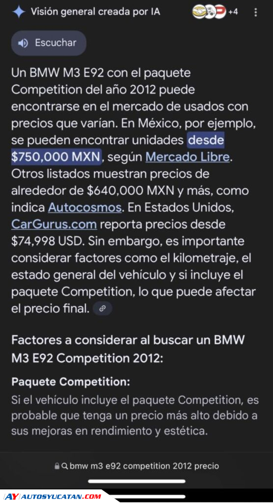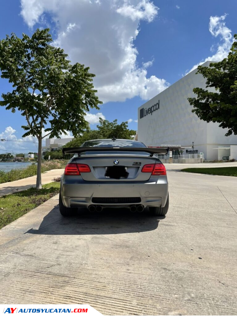 BMW M3 Competition 2012, edición limitada en color Frozen Gray, equipado con el motor original V8 4.0 S65 de 415 HP, potenciado profesionalmente hasta alcanzar 650 HP. Cuenta con un kit ESS Tuning S65 G1 con supercargador Vortech V-3 e intercooler, repro Stage 2 en motor y caja, escape completo Akrapovic de titanio (cat-back), e inyección de agua-metanol Snow Performance Stage 2.5 Power Max Pro Line, con relojes y medidores incluidos. También incorpora filtro de alto flujo K&N, modificación estética de los aros de ángel en los faros (con cambio de color vía app), alerón APR de fibra de carbono, volante forrado en Alcántara, rines 19 recién pintados en negro piano con perlas azules, y calipers en azul cielo. El vehículo proyecta el emblema M al abrir las puertas, tiene luces LED interiores y exteriores, asientos de piel negra con costuras rojas, techo de fibra de carbono reacondicionado, paddle shifts al volante, batería nueva y cuatro llantas nuevas. Ha alcanzado 290 km/h sin inconvenientes, con capacidad real para llegar a los 300 km/h. Tiene poco más de 20 mil dólares invertidos en mejoras de motor y transmisión, y conserva la factura original.