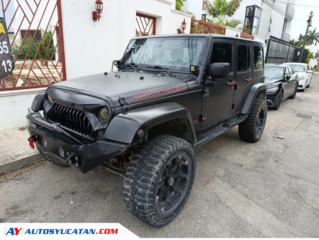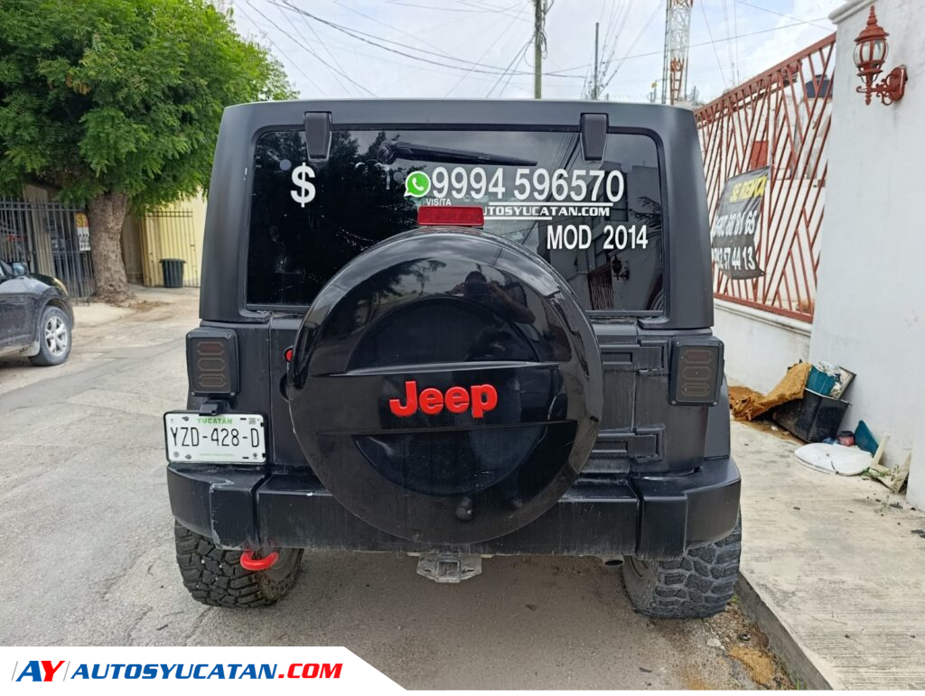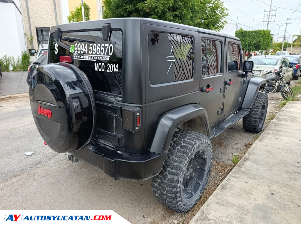 Solicita más informaciónJeep Sahara 4x4 2014 con acabado full wrap en negro mate, equipado con cámara de reversa auxiliar, llantas Cooper Discoverer STT PRO de 35…
