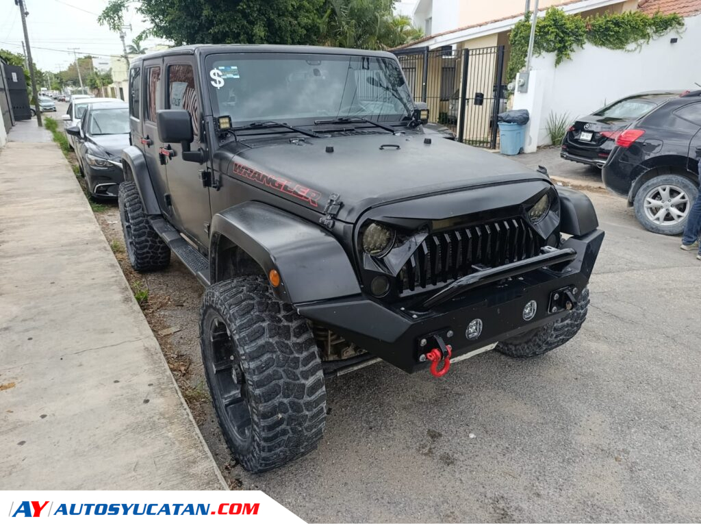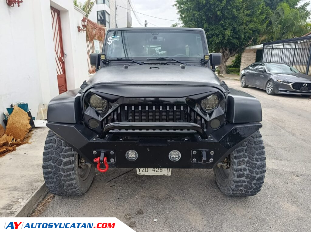 Jeep Sahara 4×4 2014 con acabado full wrap en negro mate, equipado con cámara de reversa auxiliar, llantas Cooper Discoverer STT PRO de 35 pulgadas montadas en rines XD Series de 20 pulgadas, pasos de rueda y espaciadores. Cuenta con módulo AEV Procal, suspensión elevada 4 pulgadas con amortiguadores Fox y amortiguador de dirección Fox Factory Race 2.0. Incluye defensa delantera de acero para winch Rock Crawler, halógenos Rigid Industries, luces auxiliares, parrilla frontal estilo Angry Bird, jaladeras de acero Rough Country y cubre llanta rígido.